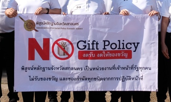 | พ.ต.อ.หญิงมณัฎฐ์ชนก มหาชนะวงศ์ นวท.(สบ 4) พฐ.จว.สกลนคร นำข้าราชการตำรวจ พฐ.จว.สกลนคร ประกาศเจตนารมณ์ที่จะไม่รับของขวัญหรือของกำนัลทุกชนิดจากการปฏิบัติหน้าที่ (No Gift Policy) เพื่อสร้างวัฒนธรรมองค์กรและค่านิยมสุจริตในการปฏิบัติงาน ไม่ยอมรับระบบอุปถัมภ์ หลีกเลี่ยงการกระทำอันอาจมีผลต่อดุลยพินิจหรือการตัดสินใจการปฏิบัติหน้าที่ซึ่งนำไปสู่การเลือกปฏิบัติ ป้องกันการปฏิบัติหน้าที่อย่างไม่เป็นธรรม และไม่ให้เกิดประโยชน์ทับซ้อน พร้อมทั้งสร้างความเชื่อมั่นต่อประชาชนในการปฏิบัติหน้าที่อย่างธรรมาภิบาล |